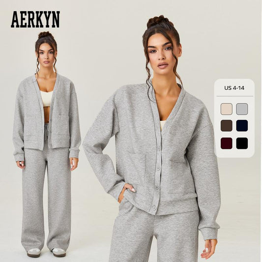 Katchme&Aerkyn Women'S Slouchy Solid Color V Neck Long Sleeve Button Cardigan & Drawstring Waist Trousers Co-Ord, Soft Two Piece Outfits for Fall & Winter(Cn)